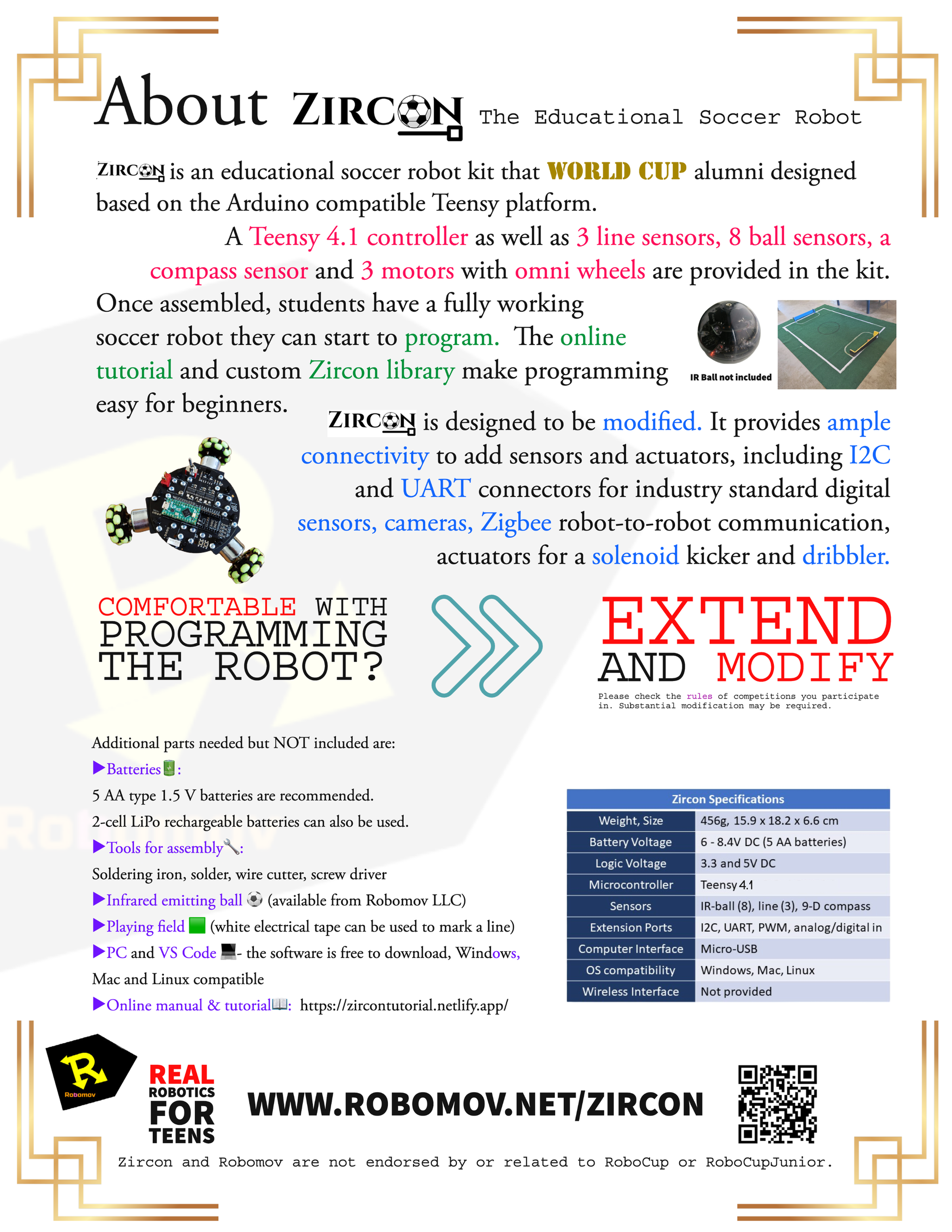 - Zircon Board x1: Experience the power of cutting-edge technology with the Zircon Board, a key component that brings your soccer robot to life.